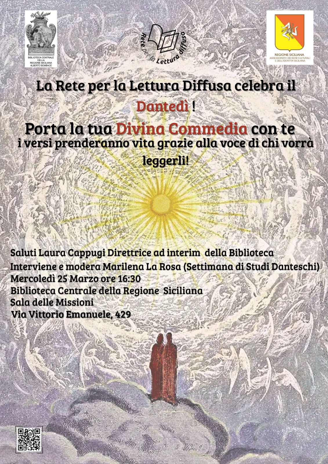 In occasione del Dantedì, la giornata nazionale dedicata a Dante Alighieri che si celebra il 25 marzo, la Rete per la Lettura Diffusa - insieme alla Settimana di Studi Danteschi e con la collaborazione della Biblioteca centrale della Regione siciliana - organizza un evento speciale aperto a tutti, pensato per appassionati di letteratura, studenti e curiosi.